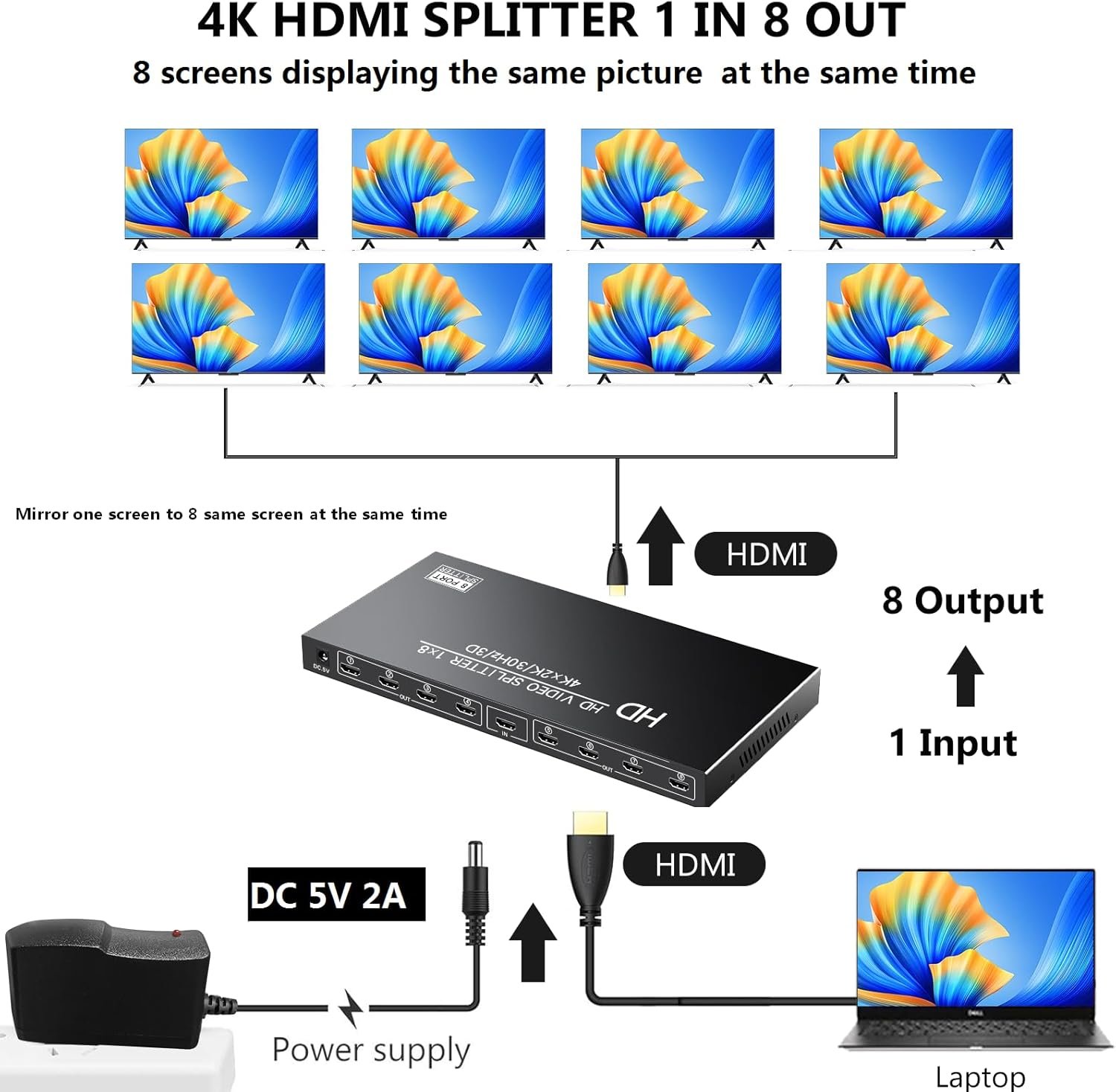 📺 8-Port HDMI Output – Mirrors one HDMI source to eight displays