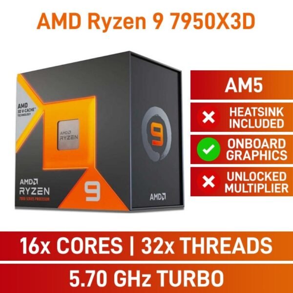 The AMD Ryzen 9 7950X3D is a flagship AM5 processor designed for gamers, creators, and power users who want the best of both worlds — blazing-fast gaming and unmatched productivity. Featuring 16 cores and 32 threads with a 4.2 GHz base clock and boost speeds up to 5.7 GHz, it delivers incredible single-thread and multi-thread performance. AMD’s groundbreaking 3D V-Cache technology triples the L3 cache capacity, giving you lightning-fast game load times and smoother performance in CPU-intensive titles. Built on AMD’s Zen 4 architecture, it supports DDR5 memory and PCIe 5.0, making it the perfect choice for next-gen, future-proof PC builds.