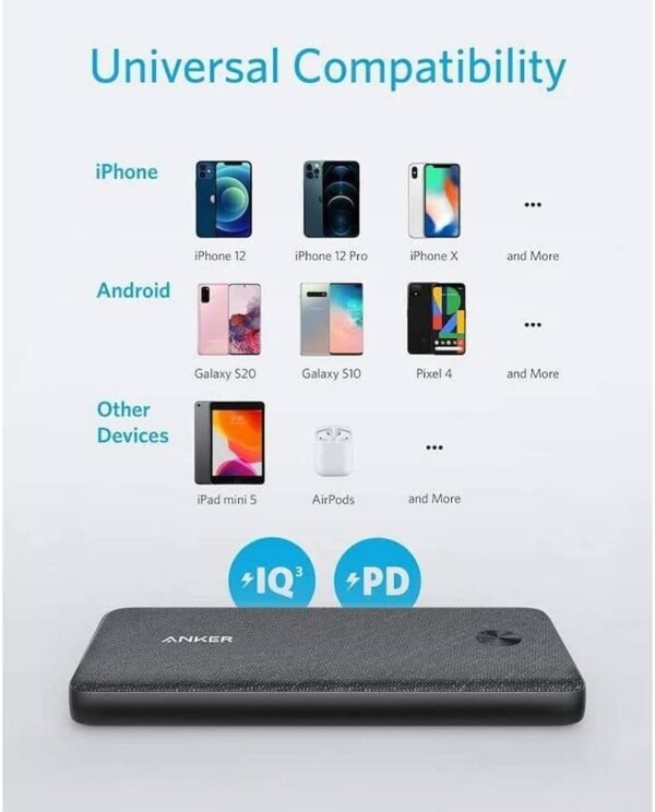The Anker PowerCore III Sense 10K is a sleek and powerful portable charger designed for fast charging and everyday portability. With 20W USB-C Power Delivery and a 10,000mAh battery, it delivers high-speed charging for smartphones, tablets, and accessories. Its dual-port output and stylish fabric exterior make it ideal for travel, work, and daily use.