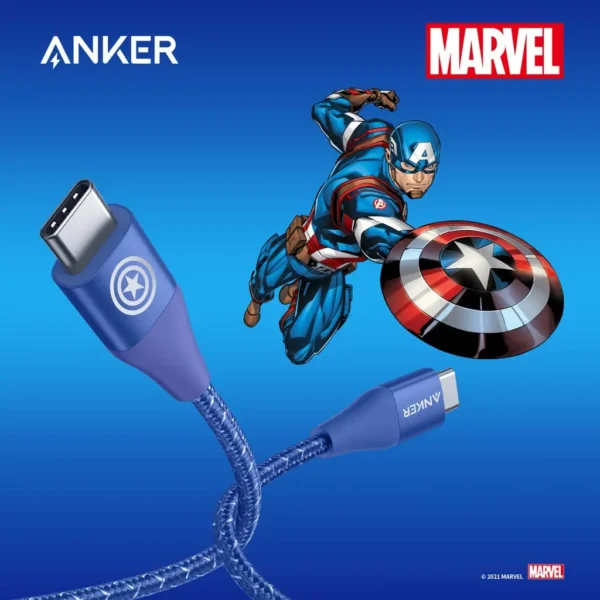 The Anker PowerLine+ II USB-C to Lightning Cable (A9551031) Captain America Edition delivers fast charging and data sync in a bold Marvel-themed design. Featuring Captain Americaβs shield motif and a 6ft braided nylon build, this cable supports USB Power Delivery for iPhone, iPad, and other Lightning devices. MFi certified and built for fans who demand performance, style, and extended reach.