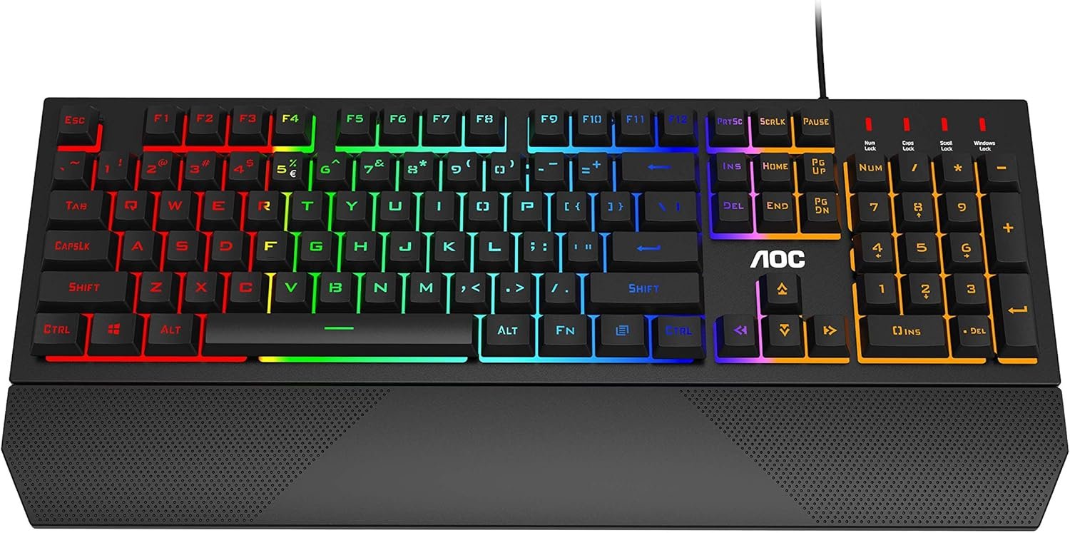 The AOC GK200 is a full-size gaming keyboard designed for players who want vibrant RGB lighting and dependable performance. Featuring membrane switches for quiet operation, it offers responsive input with a durable build. Its USB wired connection ensures stable gameplay, while customizable lighting modes add flair to every session.