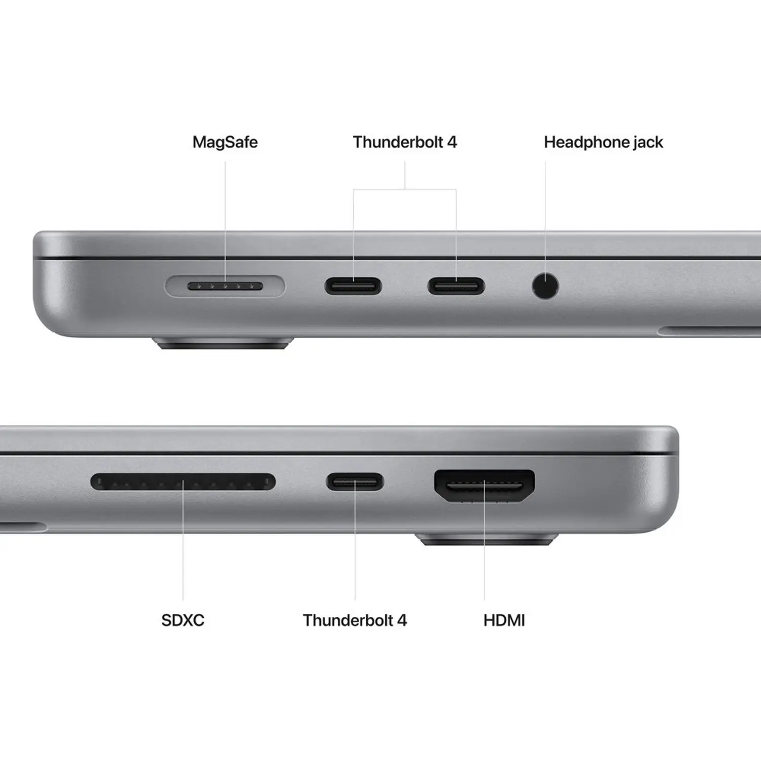 | Ports | 3× Thunderbolt 4 (USB‑C), 1× HDMI, 1× SDXC card slot, 1× 3.5mm headphone jack, MagSafe 3 charging port |