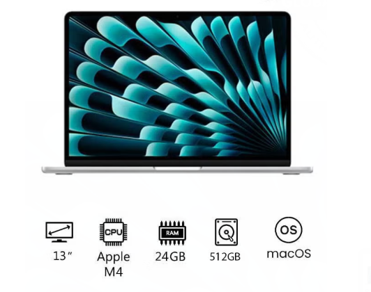 Apple MC654ZP/A MacBook Air 13‑inch (M4, 2025) – 24GB unified memory, 512GB SSD, Silver
