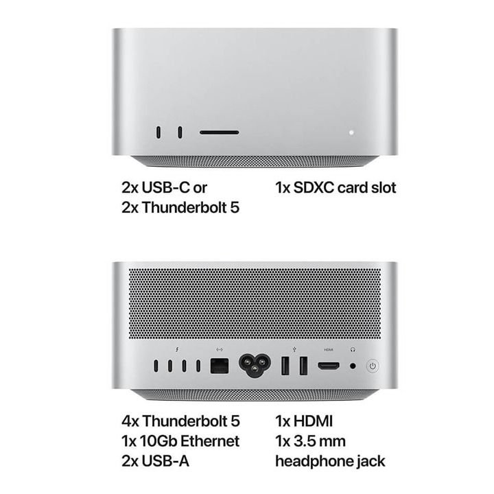 | Ports (Back) | 4× Thunderbolt 4 (USB‑C), 2× USB‑A, 1× HDMI, 1× 10Gb Ethernet, 1× 3.5mm headphone jack |