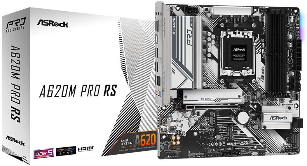 The ASRock A620M PRO RS WiFi AX is a cost-effective Micro ATX motherboard designed for AMD Ryzen 7000, 8000, and 9000 Series processors. It supports DDR5 memory, PCIe 4.0 graphics, and Gen4 M.2 storage. With integrated Wi-Fi 6E, Realtek Gigabit LAN, and modern USB connectivity, this board is ideal for budget-conscious users seeking reliable performance and wireless convenience.