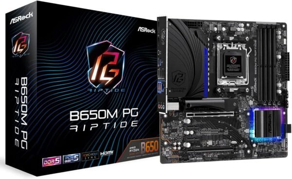 The ASRock B650M PG RIPTIDE is a compact yet powerful Micro ATX motherboard designed for AMD Ryzen 7000, 8000, and 9000 Series processors. It supports DDR5 memory, PCIe 4.0 graphics, and blazing-fast Gen5 M.2 storage. With robust power delivery, Nahimic Audio, and versatile USB connectivity, this board is ideal for gamers and creators seeking high-end features in a space-efficient form factor.