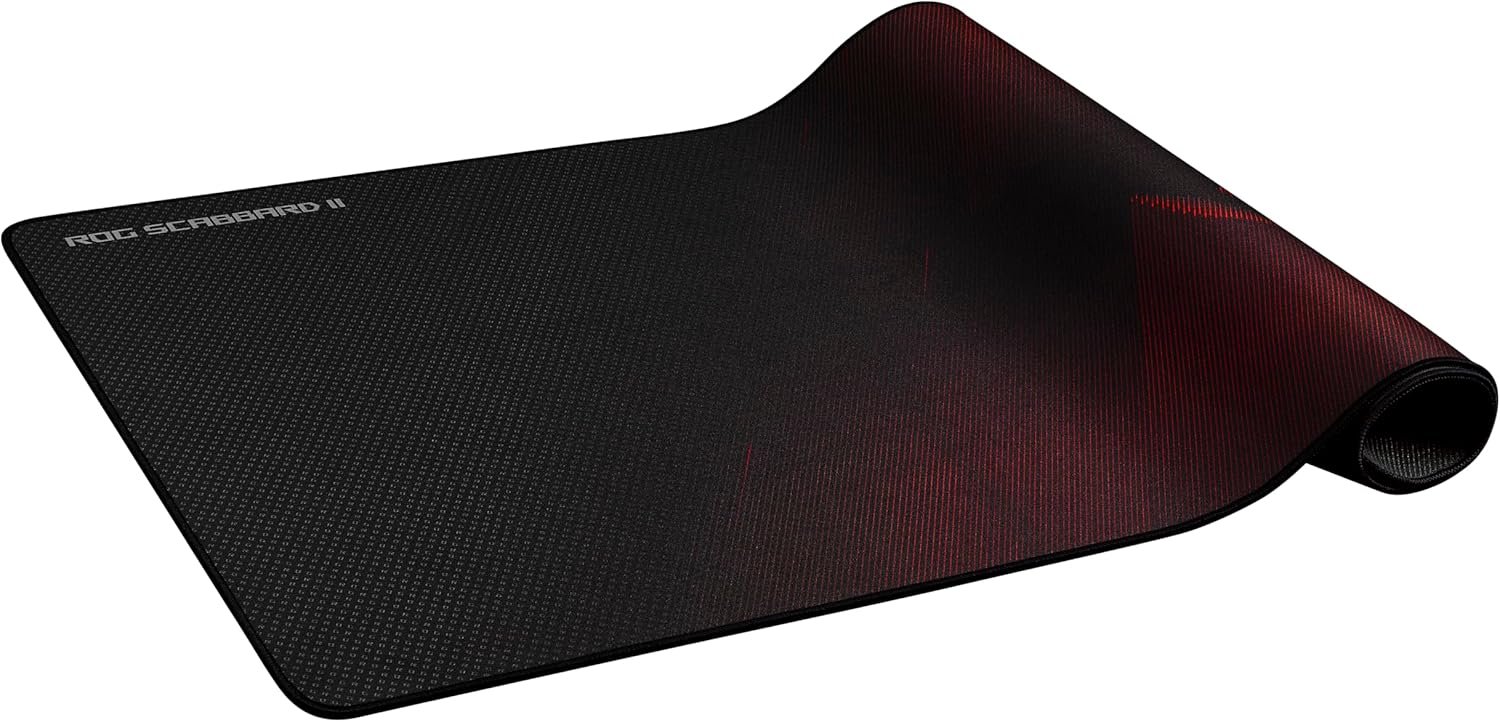 The ASUS ROG Scabbard II Extended Gaming Mouse Pad is designed to give gamers a reliable, spacious surface for both mouse and keyboard. Featuring a protective nano-coating that repels water, oil, and dust, it ensures durability and consistent glide. With anti-fray stitched edges and a non-slip rubber base, it provides stability and longevity for competitive gaming setups.
