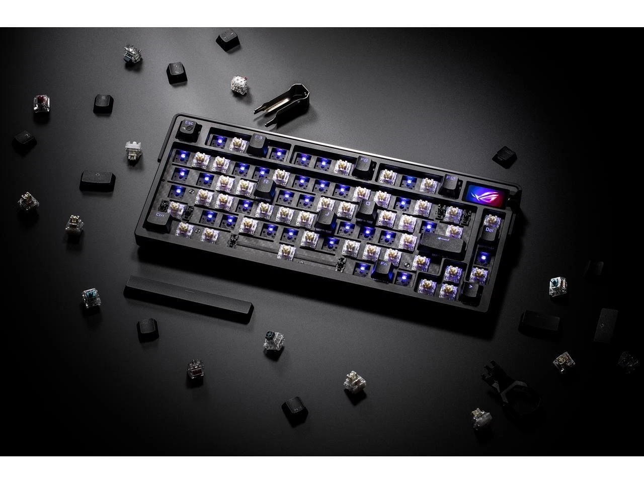 The ASUS ROG Azoth Extreme is a premium 75% wireless mechanical keyboard designed for gamers and enthusiasts who demand uncompromising performance and customization. Equipped with ROG NX Storm mechanical switches, tri-mode connectivity (RF 2.4 GHz, Bluetooth, and wired USB), and a gasket-mounted design with silicone dampening, it delivers exceptional typing feel and responsiveness. With hot-swappable switch sockets, OLED display, and Aura Sync RGB lighting, the Azoth Extreme offers a fully customizable experience for both gaming and productivity.