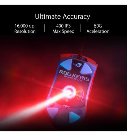 The ASUS ROG Keris Wired Gaming Mouse is designed for esports professionals and serious gamers. Featuring an advanced optical sensor, lightweight 62โgram design, and ROG Micro Switches with pushโfit sockets, it delivers precise control, customizable performance, and long-lasting durability for competitive gaming.