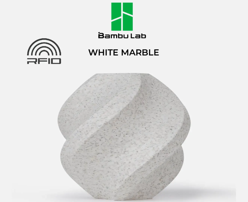 Bambu Lab PLA Marble White filament is designed to replicate the natural look of marble stone while maintaining the ease of PLA printing. It combines durability, smooth extrusion, and aesthetic brilliance, making it ideal for decorative models, artistic projects, and functional prototypes requiring a premium marble effect. Supplied on a reusable spool, it ensures consistent extrusion and eco‑friendly convenience across PLA‑capable printers.