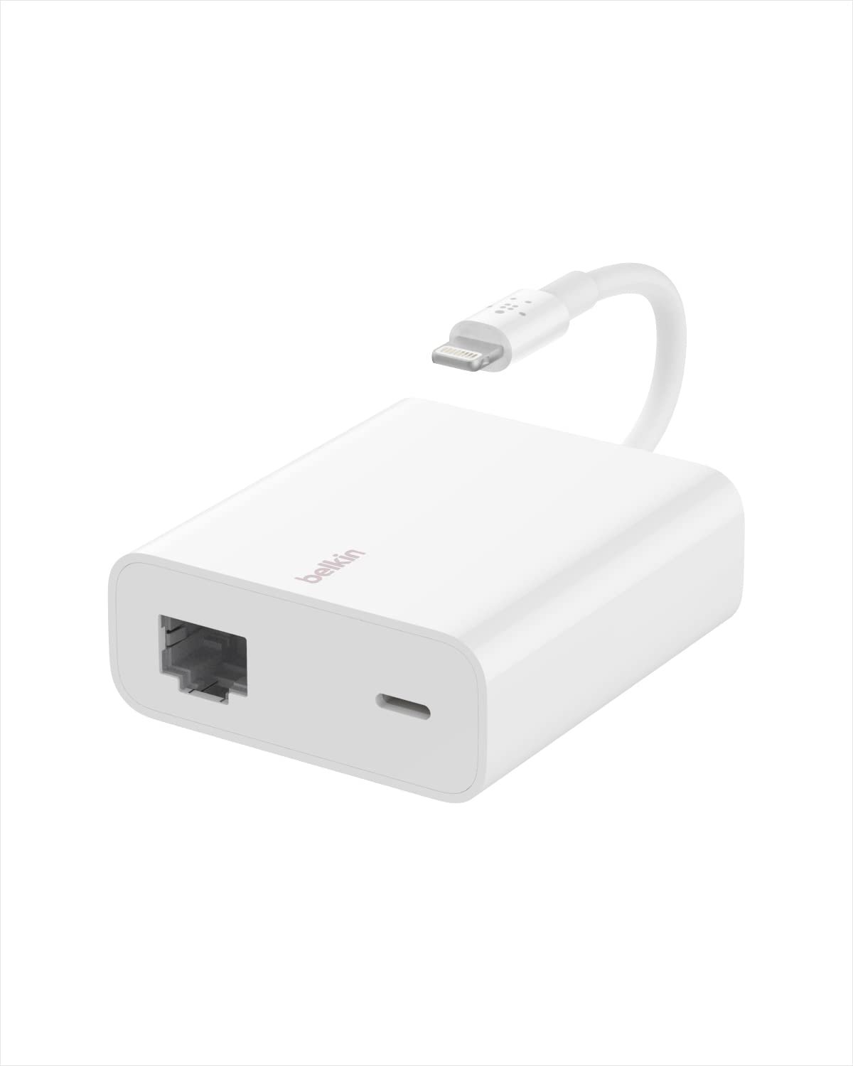The Belkin Ethernet + Power Adapter with Lightning Connector is designed to provide a secure wired internet connection and simultaneous charging for iPhone and iPad devices. Ideal for enterprise, education, and professional environments, it ensures reliable connectivity where Wi-Fi may be inconsistent or restricted. Its compact design and plug-and-play functionality make it a practical solution for users who need both power and data through a single Lightning connection.