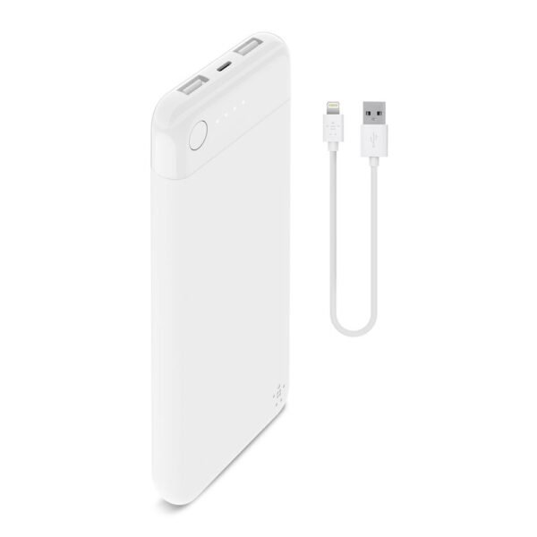 The Belkin BOOST↑CHARGE™ 10,000mAh Power Bank with Lightning Connector is a compact and portable charging solution designed specifically for iPhone and iPad users. As the first MFi-certified power bank to recharge via a Lightning connector, it allows you to use the same cable to charge both your device and the power bank. With a 10,000mAh capacity, it provides up to 70 hours of additional battery life for your iPhone or 19 hours for your iPad. The power bank features two USB-A ports, enabling you to charge two devices simultaneously. Its slim and lightweight design makes it ideal for on-the-go charging. Safety features include sensors that monitor heat, voltage, and circuitry to prevent overheating and ensure safe charging.