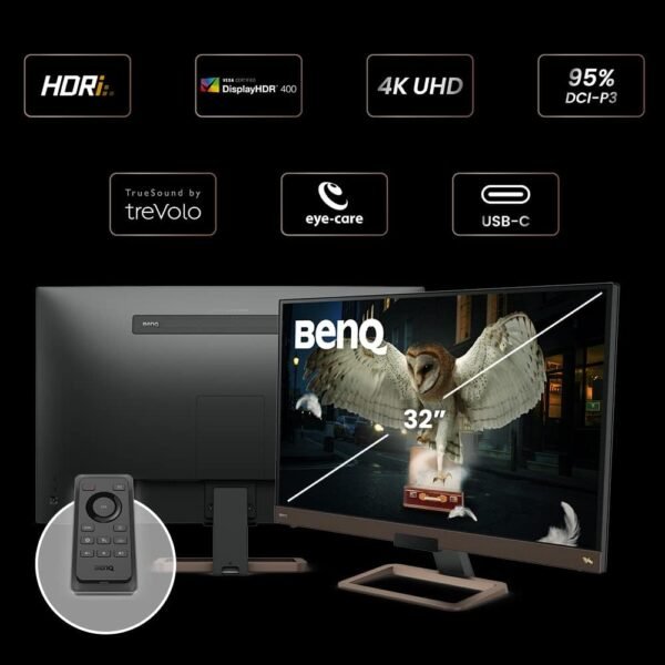 The BenQ EW3280U is a 32-inch 4K UHD multimedia monitor designed for immersive entertainment and creative work. Featuring HDRi technology, an IPS panel, and AMD FreeSync, it delivers vivid visuals with smooth motion and intelligent brightness optimization. With integrated 2.1 channel treVolo speakers and USB-C connectivity, it’s a versatile display for home cinema, gaming, and productivity.