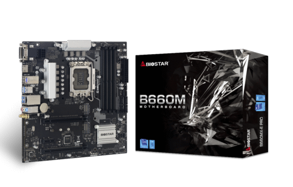 BIOSTAR B660MX-E Micro ATX Motherboard – Intel Socket LGA1700, DDR4 64GB, PCIe 4.0 x16, M.2 NVMe, HDMI + VGA, USB 3.2 Gen1, Realtek LAN + Audio