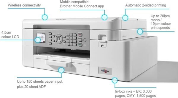 The Brother MFC-J4340DW is a compact and efficient A4 inkjet printer designed for home offices and small workgroups. It offers full 4-in-1 functionality — print, scan, copy, and fax — with support for PC-fax and automatic duplex printing. With fast print speeds up to 20 ipm (mono) and 19 ipm (color), wireless connectivity, and a 1.8″ color LCD, it streamlines everyday workflows. Compatible with Brother Mobile Connect, AirPrint, and Mopria, it supports mobile productivity and cloud integration.