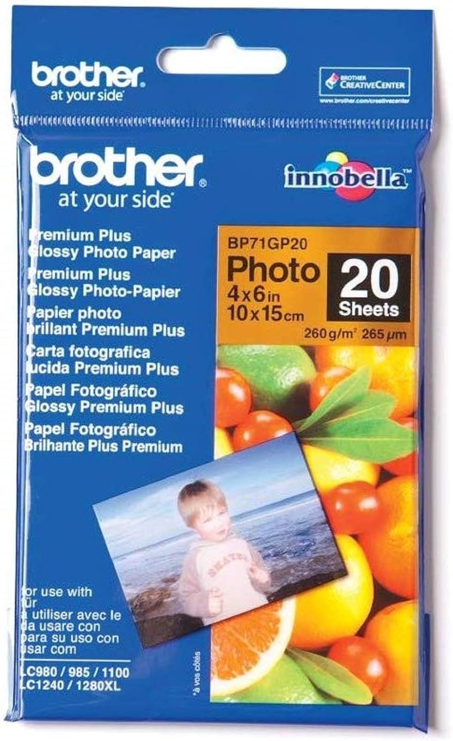 Brother BP71GP20 Photo Paper, 6 Inch × 4 Inch (15 cm × 10 cm), Premium Plus Glossy, 20 Sheets – High-resolution inkjet compatibility, fast drying, fade-resistant finish
