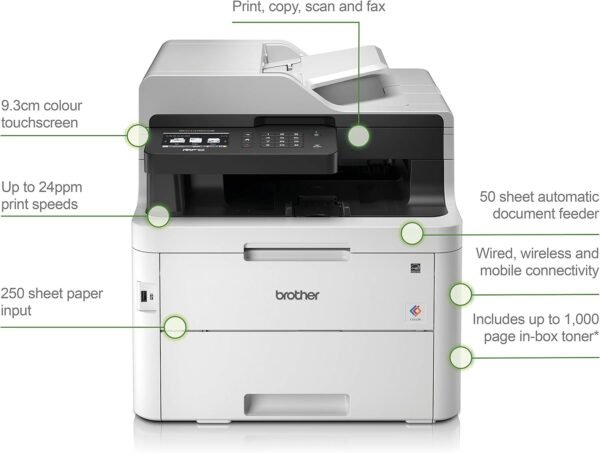 The Brother MFC-L3750CDW is a compact and reliable 4-in-1 color laser printer designed for small offices and home workspaces. It offers vibrant color printing, scanning, copying, and faxing with support for automatic 2-sided printing and wireless connectivity. With print speeds up to 24 ppm, a 50-sheet ADF, and compatibility with mobile print platforms, it streamlines document workflows while saving space and energy. The 3.7″ color touchscreen makes navigation simple, and its robust build ensures long-term reliability.