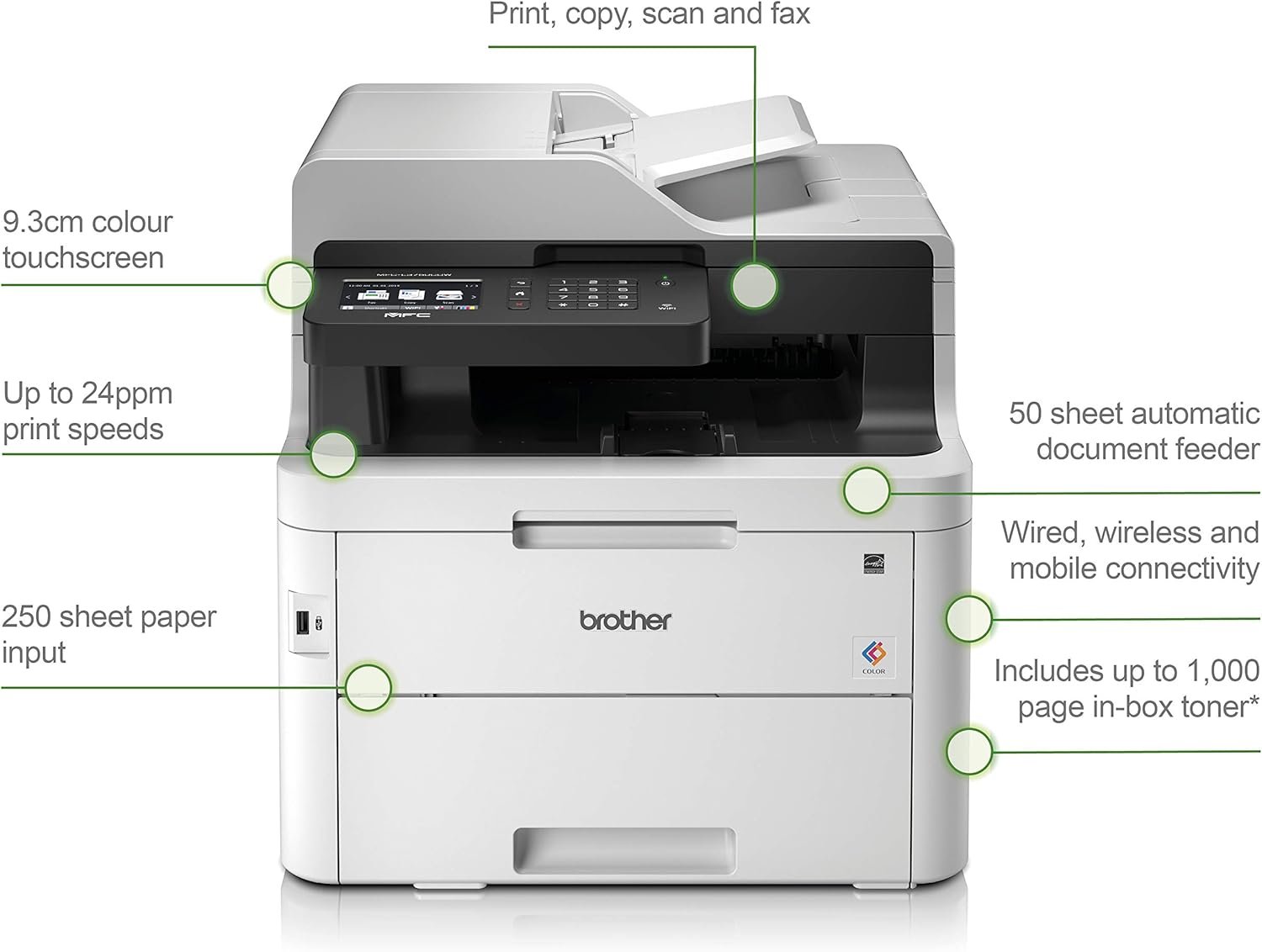 Brother MFC-L3750CDW A4 Color Laser Multi-Function Printer – Print, Scan, Copy, Fax, PC-Fax, Duplex, Wi-Fi, Ethernet, 250-sheet Tray