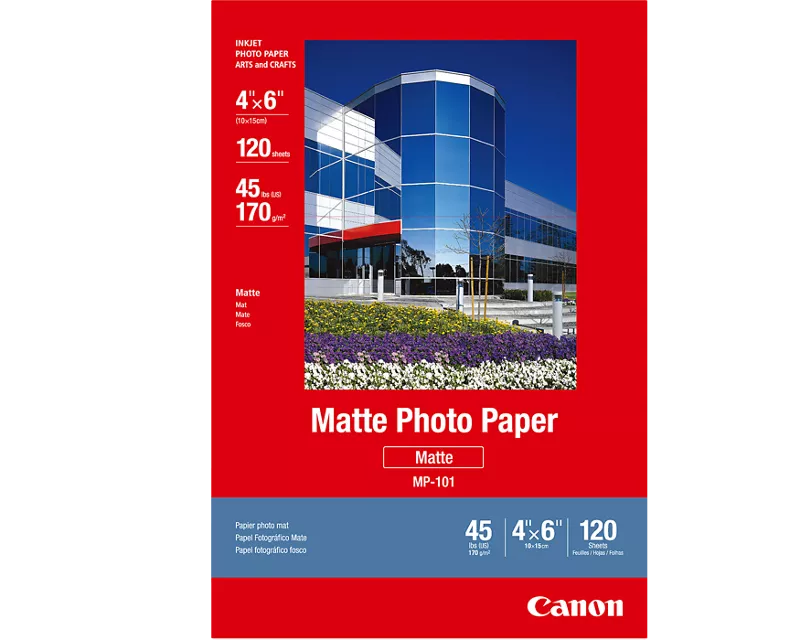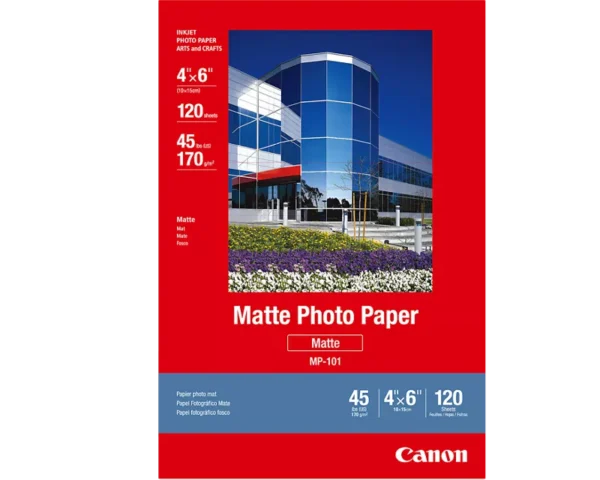 Canon MP‑101 Matte Photo Paper is designed for everyday photo printing with a soft, non‑gloss finish. It delivers sharp text, vibrant colors, and a smooth texture ideal for personal photos, creative projects, and professional presentations. With a bright white base, it enhances contrast and ensures well‑balanced image reproduction.
