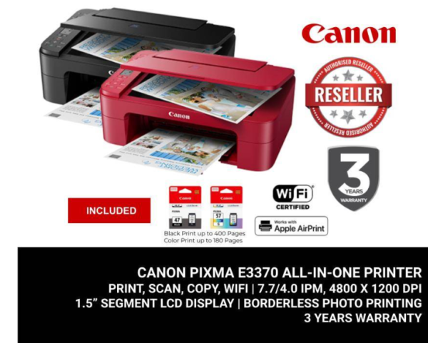 The Canon PIXMA E3370 is a compact all-in-one wireless printer designed for home and student use. With its ink-efficient cartridges, auto-duplex printing, and versatile functions including print, scan, and copy, it provides reliable everyday performance while keeping printing costs low.