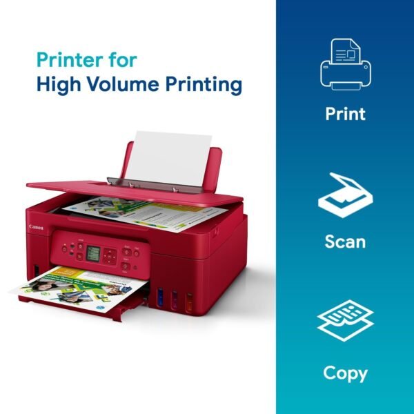 The Canon PIXMA G3770-R is a compact, high-efficiency all-in-one printer with refillable ink tanks and wireless connectivity. Designed for home and small office use, it delivers low-cost, high-volume printing with vibrant color output. Its sleek red finish adds a modern touch to any workspace.