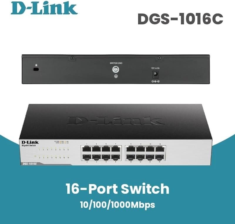 D-Link DGS-1016C 16-Port 10/100/1000Mbps Unmanaged Gigabit Switch β Metal Housing, Rackmountable, Fanless Design