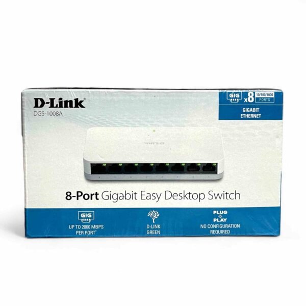 The D-Link DGS-1008A is an 8-port unmanaged Gigabit desktop switch designed for high-speed wired networking in homes and small offices. With plug-and-play simplicity, silent fanless operation, and D-Link Green technology, it delivers reliable performance while conserving energy. Built-in QoS ensures smooth data prioritization for time-sensitive applications like streaming and VoIP.