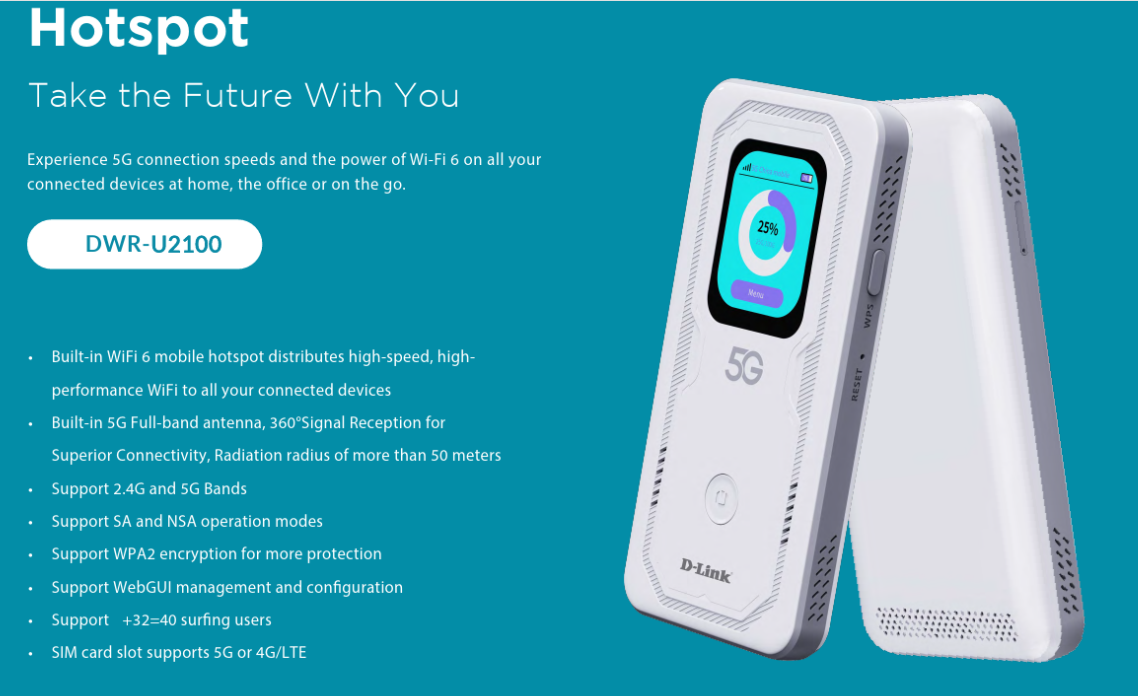 D-Link DWR-U2100 5G NR Wi-Fi 6 AX900 Mobile Wi-Fi Hotspot – Ultra-Fast Portable Connectivity