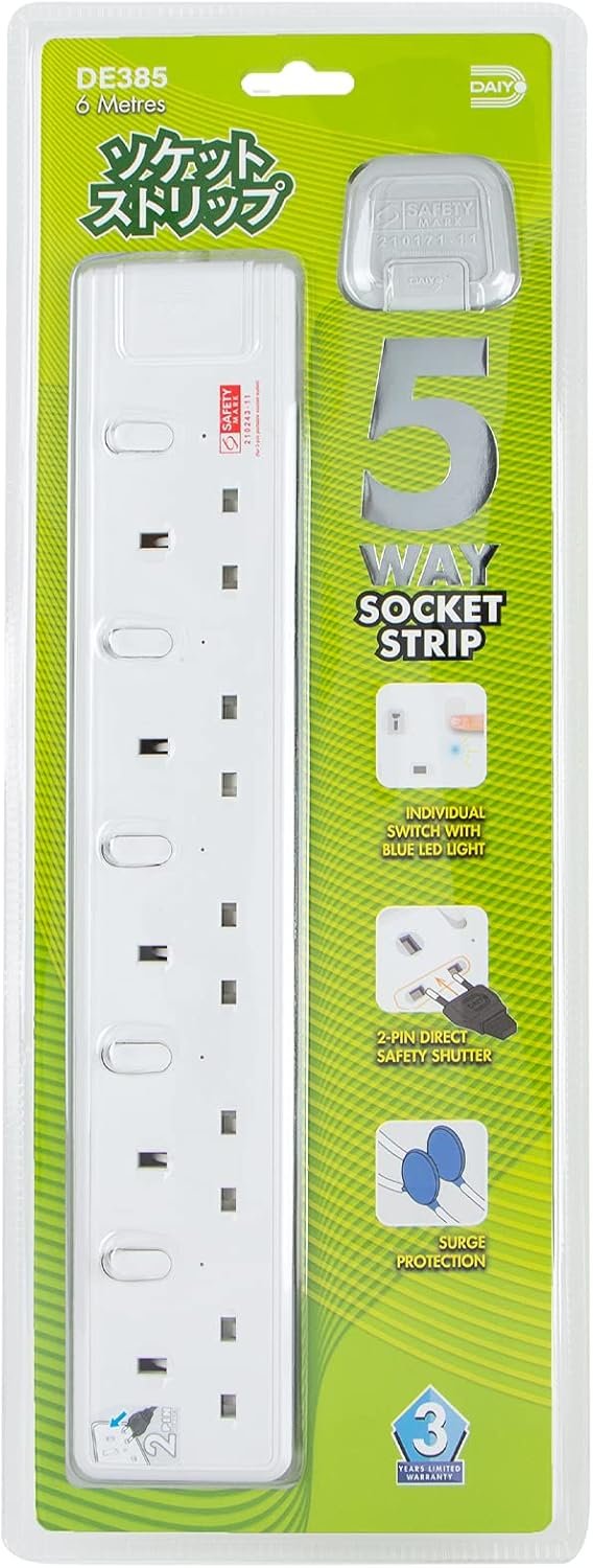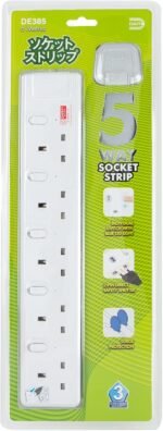 The DAIYO DE385-6M is a premium 5-way extension socket strip designed for safe and convenient power distribution. Each socket features an individual LED-lit switch for clear visual control. The unit includes solid-state surge protection circuitry to safeguard connected devices against voltage spikes. With a 6-meter cable, flame-retardant housing, and safety shutters, itβs ideal for home, office, and workstation use. Certified with the Singapore Safety Mark for trusted performance.