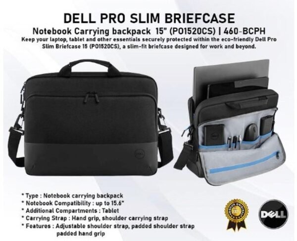 The Dell Professional Slim Briefcase 15 (460-BCTR) is designed to provide a sleek and professional solution for carrying your 15″ laptop and accessories. Crafted with a focus on durability and style, this briefcase offers a streamlined design that fits comfortably in your daily routine. Its lightweight construction ensures easy portability, while the padded compartments provide secure storage for your devices.