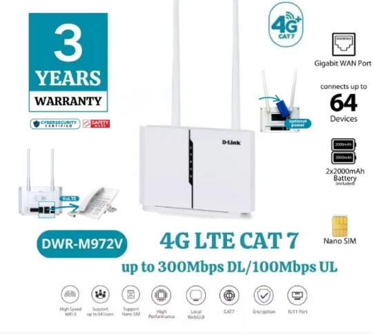 The D-LINK DWR-M972V is a powerful LTE Cat 7 router designed to deliver high-speed mobile broadband with fixed-line backup. With LTE-Advanced speeds up to 300 Mbps and dual-band AC1200 Wi-Fi, it supports smooth streaming, video conferencing, and online gaming. The built-in SIM slot enables 4G LTE connectivity, while Gigabit Ethernet ports provide fast wired access. Failover functionality ensures automatic switching between mobile and fixed-line networks for uninterrupted internet. Ideal for homes, small businesses, and rural deployments.