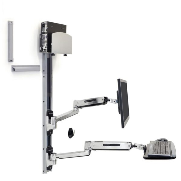 Ergotron 45-358-026 LX Sit-Stand Wall Mount System β Polished Aluminum, includes LCD arm, keyboard tray, and medium silver CPU holder, supports sit-stand flexibility with full articulation, compatible with VESA mounts and wall track systems
