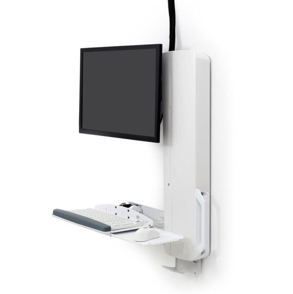 The StyleViewยฎ Sit-Stand Vertical Lift is a compact wall-mounted workstation designed for high-traffic areas such as hospital corridors and shared clinical spaces. It offers 18″ (45.7 cm) of vertical lift for ergonomic sit-stand flexibility and folds to just 4″ (10.2 cm) when not in use. The auto-retracting keyboard tray minimizes wall protrusion, while integrated cable management and smooth monitor pan enhance usability and hygiene.