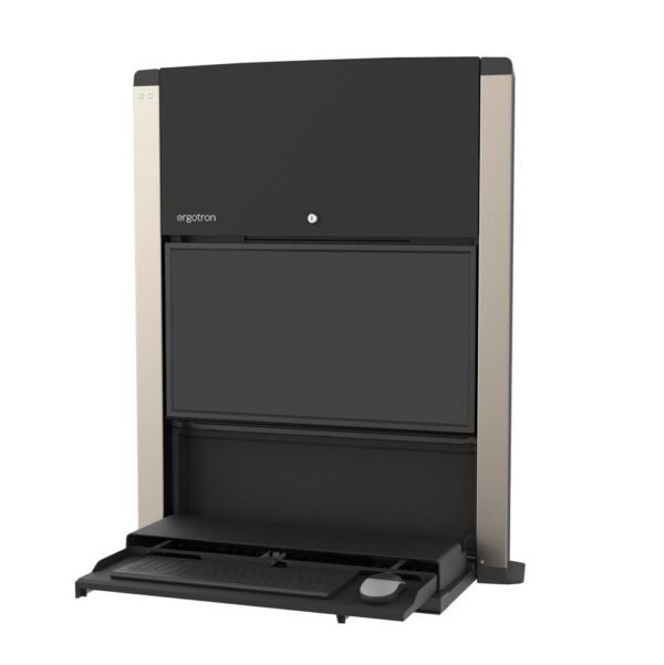Ergotron 61-367-060 CareFitยฎ 24-inch Sit-Stand Enclosure โ Matte Black finish; supports monitors up to 27″ and 23.5 lbs (10.7 kg); includes foldable keyboard tray, mouse pouch, wrist rest, cable wrap, thin client holder, and locking access panel