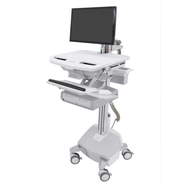 The Ergotron SV44-12A2-3 StyleView Cart is a compact LiFe-powered mobile workstation designed for secure medication access and clinical documentation across UK, Ireland, Hong Kong, Malaysia, Singapore, and Saudi Arabia (UK standard) healthcare environments. Featuring two locking drawers and an LCD monitor arm, this cart supports ergonomic workflows, secure storage, and flexible display positioning. The regional variant ensures compliance with UK-style electrical and safety standards.
