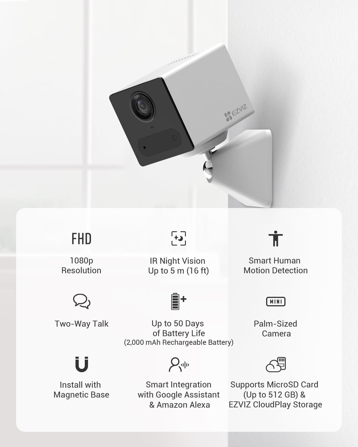 | Storage | MicroSD card slot (up to 512GB), EZVIZ CloudPlay |