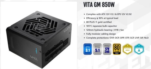 The VITA GM 850W is a next-gen power supply designed to meet the demands of modern gaming and creator systems. With ATX 3.1 and PCIe Gen5.1 compliance, it supports high-power GPUs via a native 12VHPWR cable. The unit delivers 80 Plus Gold efficiency, features a fully modular cable system, and includes a 120mm hydraulic bearing fan for quiet cooling. Built with 105ยฐC Japanese bulk capacitors and advanced protection circuitry, it ensures stable and reliable performance under heavy loads.