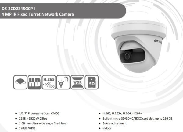 Hikvision DS-2CD2345G0P-I 4MP Super Wide Angle Fixed Turret Network Camera β 1.68mm Lens, 180Β° Horizontal Field of View, IP67 Rated