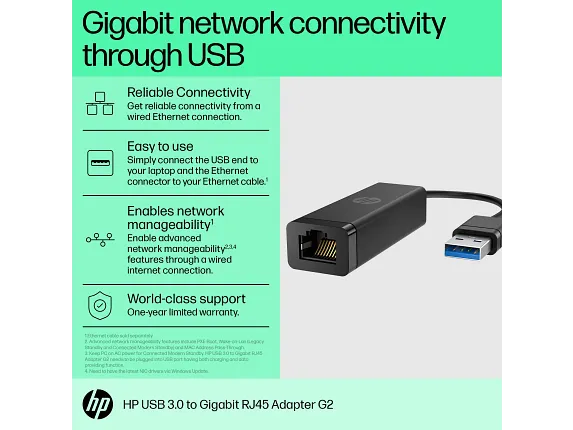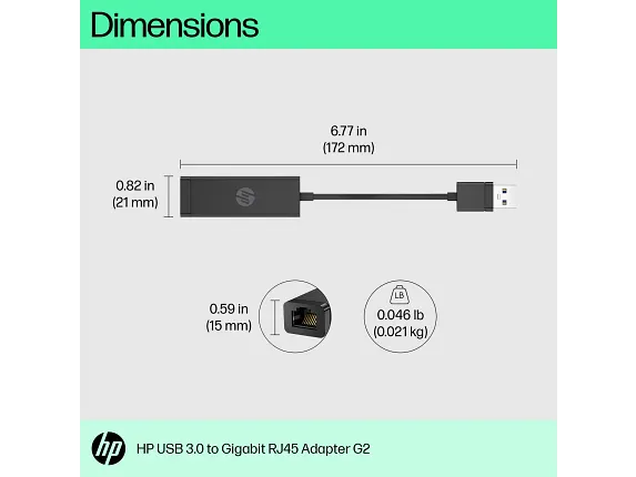 The HP USB 3.0 to Gigabit RJ45 Adapter G2 (4Z7Z7AA) provides a simple and reliable way to connect HP laptops and desktops without built‑in Ethernet ports to wired networks. Compact and portable, it ensures fast and stable Gigabit connectivity for business, education, and home environments.