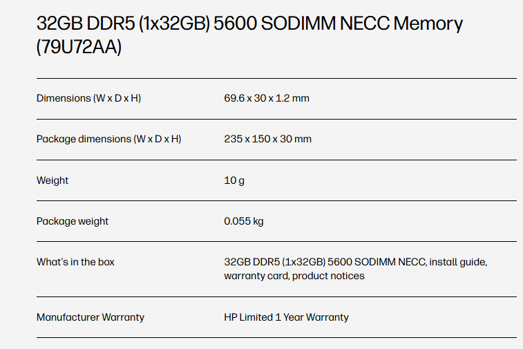 HP 32GB DDR5 5600 SODIMM NECC Memory (Model: 79U72AA) β 1x32GB Module