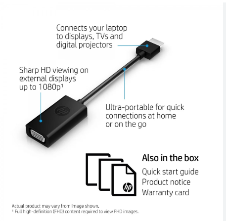 | Package Contents | HP HDMI to VGA Adapter, Documentation |