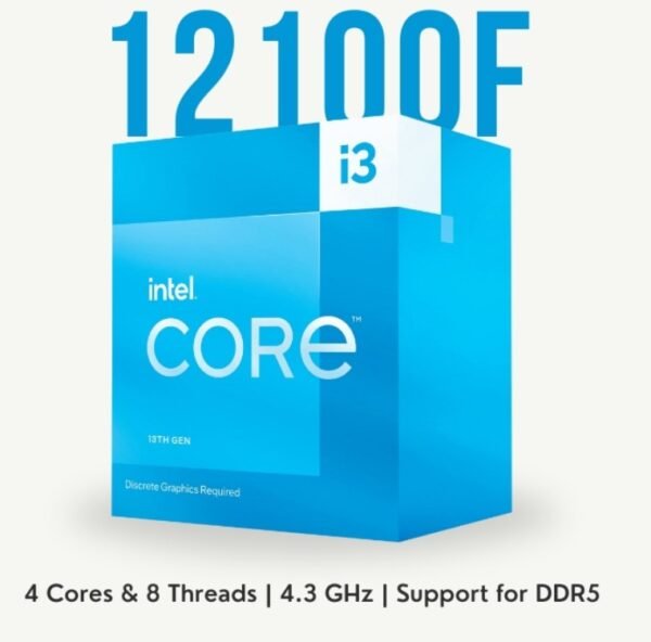 Intel Core i3-12100F Processor (BX8071512100F) โ 12th Gen Alder Lake quad-core CPU with 3.3GHz base frequency, 8 threads, 12MB Smart Cache, up to 4.3GHz turbo, LGA1700 socket, 60W TDP, and boxed packaging (no integrated graphics)
