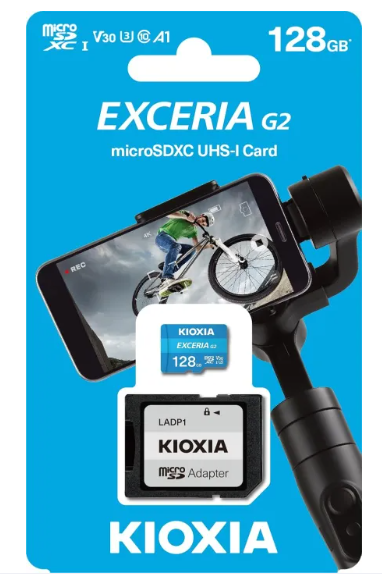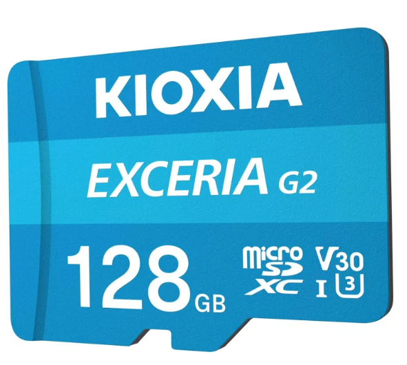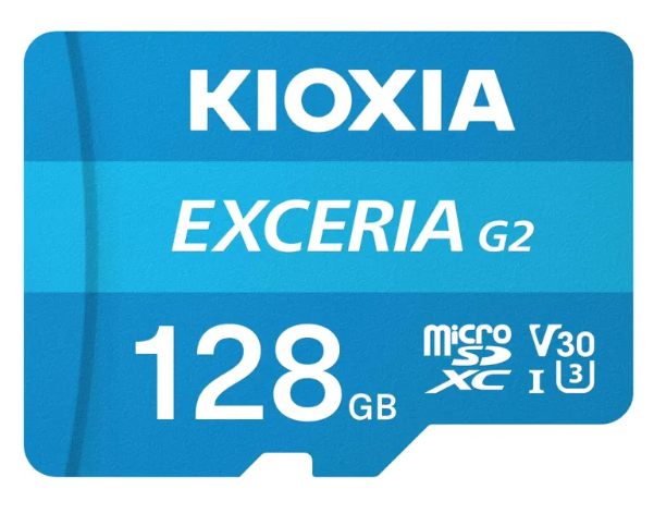 The KIOXIA EXCERIA G2 microSDXC card with adapter provides fast, reliable storage for smartphones, tablets, cameras, drones, and gaming devices. With 128GB capacity, 4K video support, and optimized app performance, it ensures smooth recording, responsive usage, and versatile compatibility.