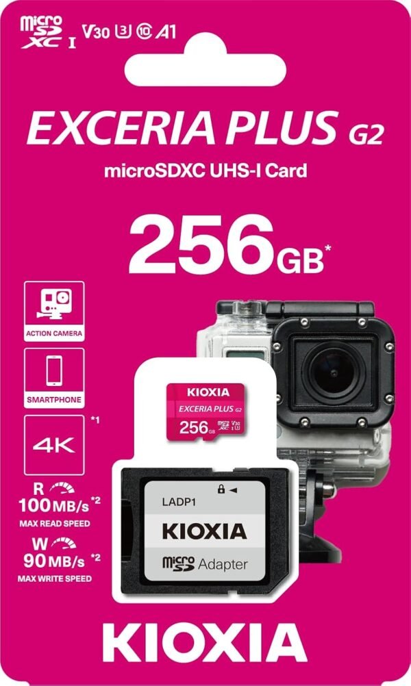The KIOXIA EXCERIA PLUS G2 microSDXC 256GB card is designed for demanding users who need faster write speeds and reliable performance. With read speeds up to 100 MB/s and write speeds up to 90 MB/s, it enables smooth 4K video capture, responsive app performance, and efficient storage expansion for smartphones, cameras, drones, and portable consoles.