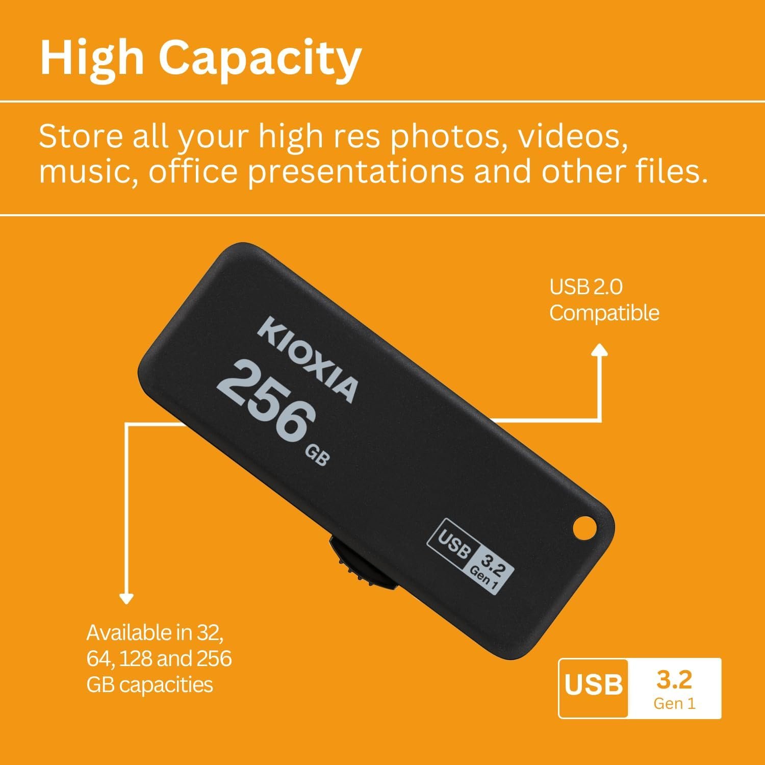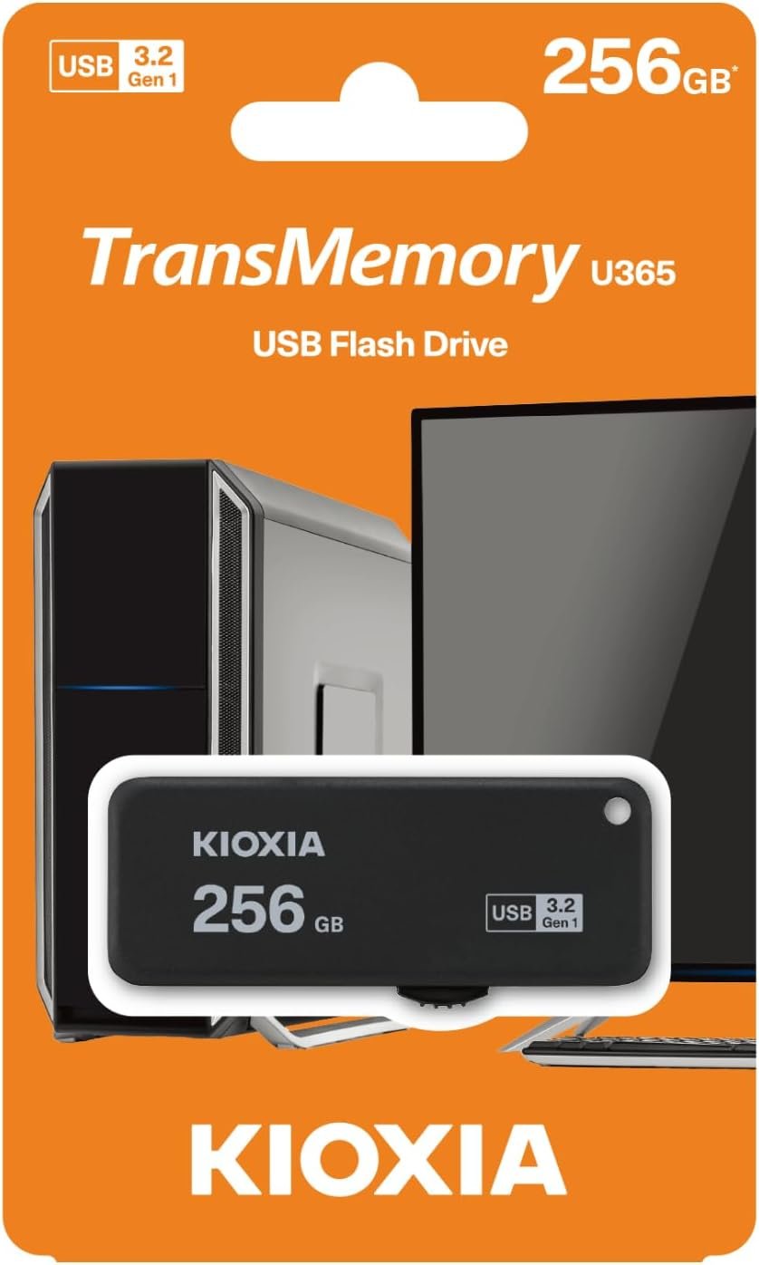 The KIOXIA TransMemory U365 USB Flash Drive combines large capacity with high‑speed performance. Featuring a sliding retractable connector and USB 3.2 Gen 1 interface, it delivers up to 150MB/s read speeds for fast transfers of documents, photos, videos, and backups. Designed for everyday portability and professional use.