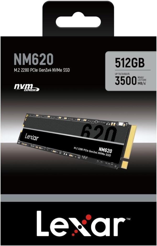 The Lexar NM620 512GB SSD offers high-speed NVMe performance for users seeking faster boot times, smoother multitasking, and efficient data handling. Built with PCIe Gen3x4 NVMe 1.4 interface and 96-layer 3D TLC NAND, it delivers up to 3500MB/s read and 2400MB/s write speeds in a compact M.2 2280 form factor, ideal for gaming, content creation, and everyday computing.