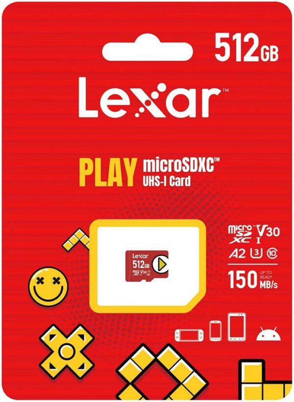 The Lexar PLAY microSDXC 512GB card is built for gamers, streamers, and mobile users who need fast, reliable storage for large game libraries, HD/4K video, and app performance. With UHS-I interface, Video Speed Class 30 (V30), and Application Performance Class A2, it delivers smooth playback, quick app launches, and responsive performance across Nintendo Switch, Steam Deck, smartphones, tablets, and other portable devices.