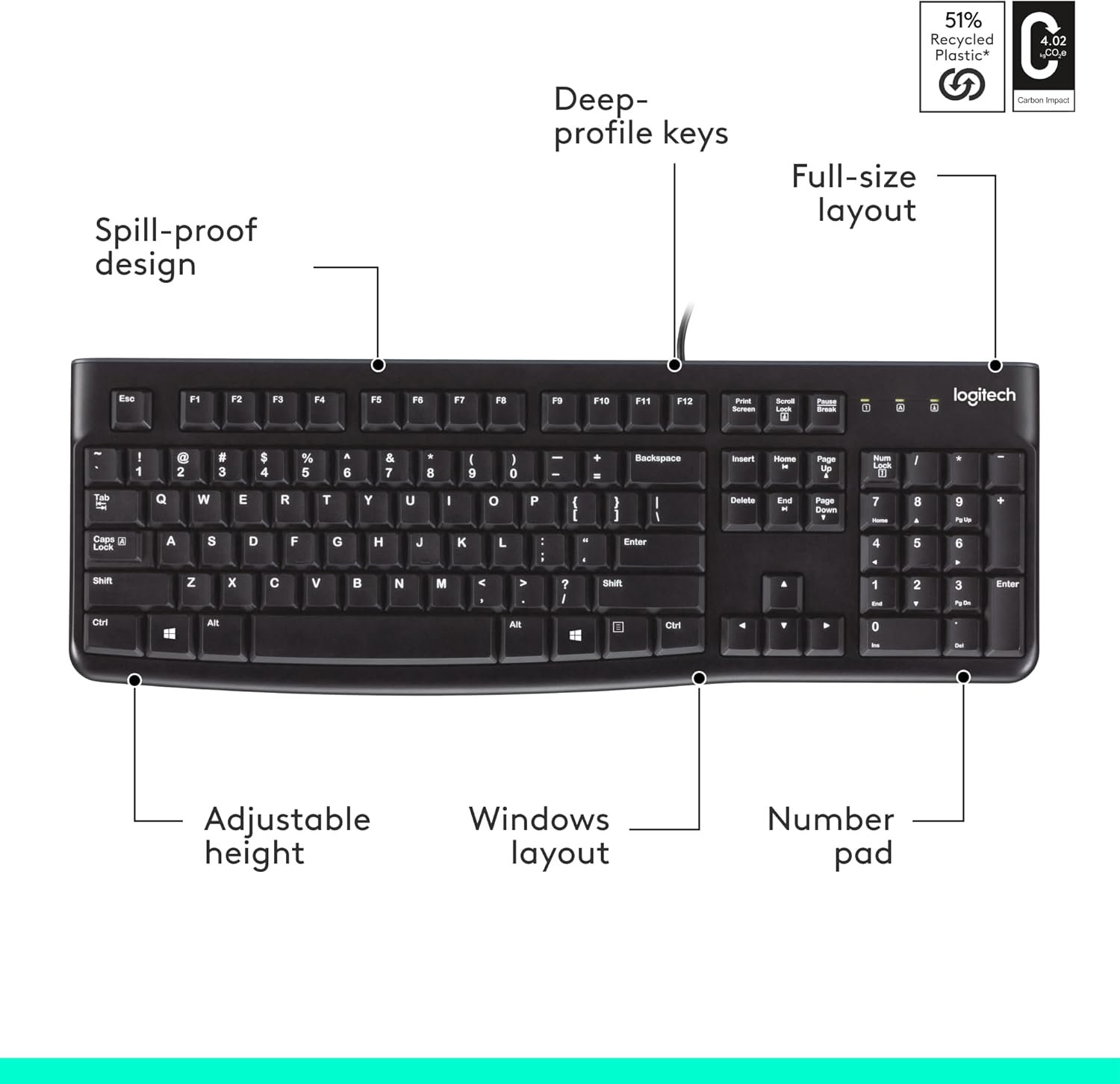 Logitech K120 Wired Keyboard – Model 920-002582, Full-Size USB Keyboard with Spill-Resistant Design