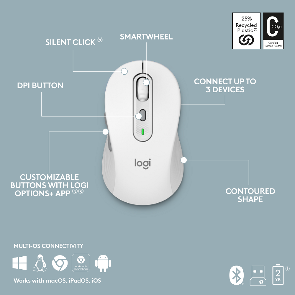 | Connectivity | Bluetooth Low Energy or Logi Bolt USB receiver |