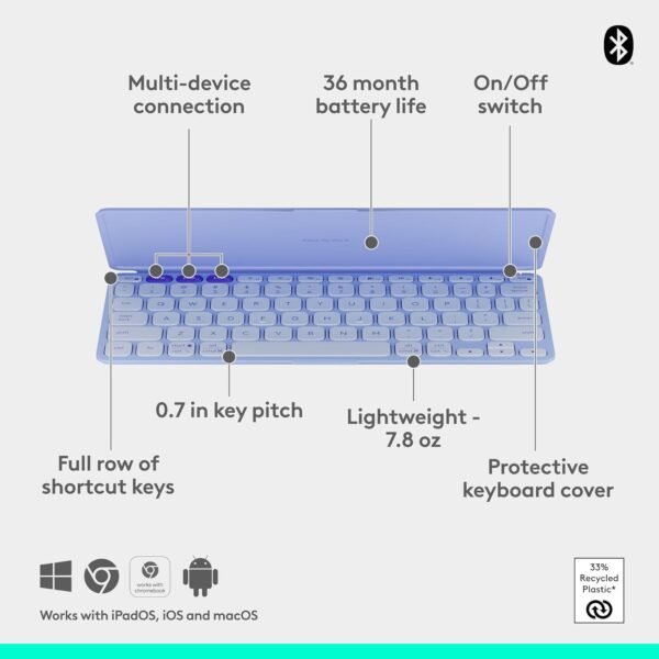 The Logitech Keys‑To‑Go 2 is an ultra‑slim, lightweight wireless keyboard designed for universal compatibility across tablets, smartphones, and laptops. With Bluetooth® connectivity, spill‑resistant FabricSkin covering, and quiet typing, it’s perfect for mobile productivity. The Lavender finish adds a fresh, stylish touch to your setup.